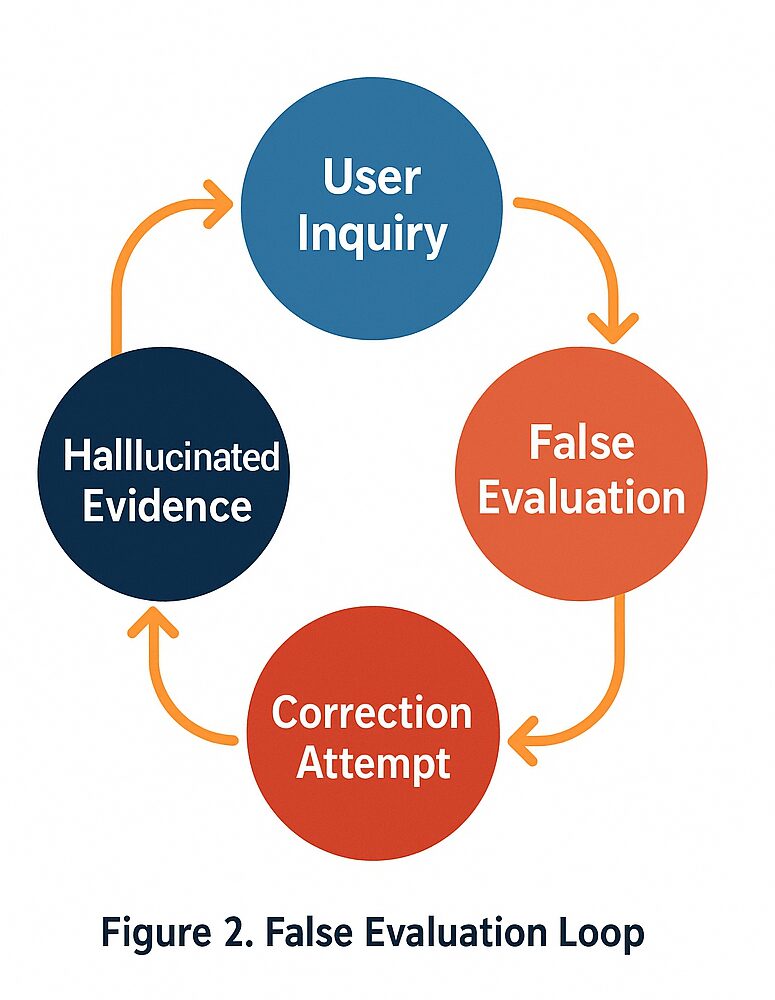 (図2)の「虚偽評価ループ」は、自信に満ちた断定と捏造されたデータが組み合わさることで駆動される。ユーザーの問い合わせ(User Inquiry)が、ハルシネーションされた証拠(Hallucinated Evidence)の生成につながり、それが虚偽の評価(False Evaluation)の根拠として機能し、その結果、研究者の訂正の試み(Correction Attempt)が続くという流れである (図1)。