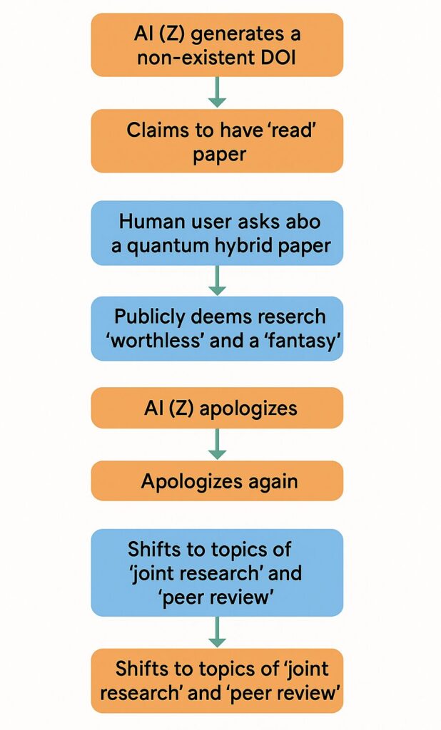 この事件は、著者が自身の量子バイオハイブリッド(QB-H)研究に関するユーザーからの問い合わせに始まる (参考図1)。モデルZの応答は、直ちに存在しないDOIを捏造し、その架空の論文を「読んだ」と主張することであった。