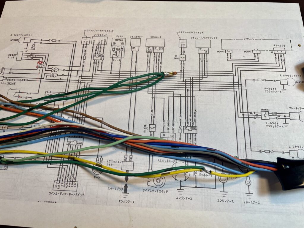 配線図と突き合わせて確認したところ、ちょっと違う☺️。なんと前期型ハーネスが流用されていました。これを2000年仕様に修正し、途中の継ぎ足しや支線を整理。これで正しい電気経路が復元。