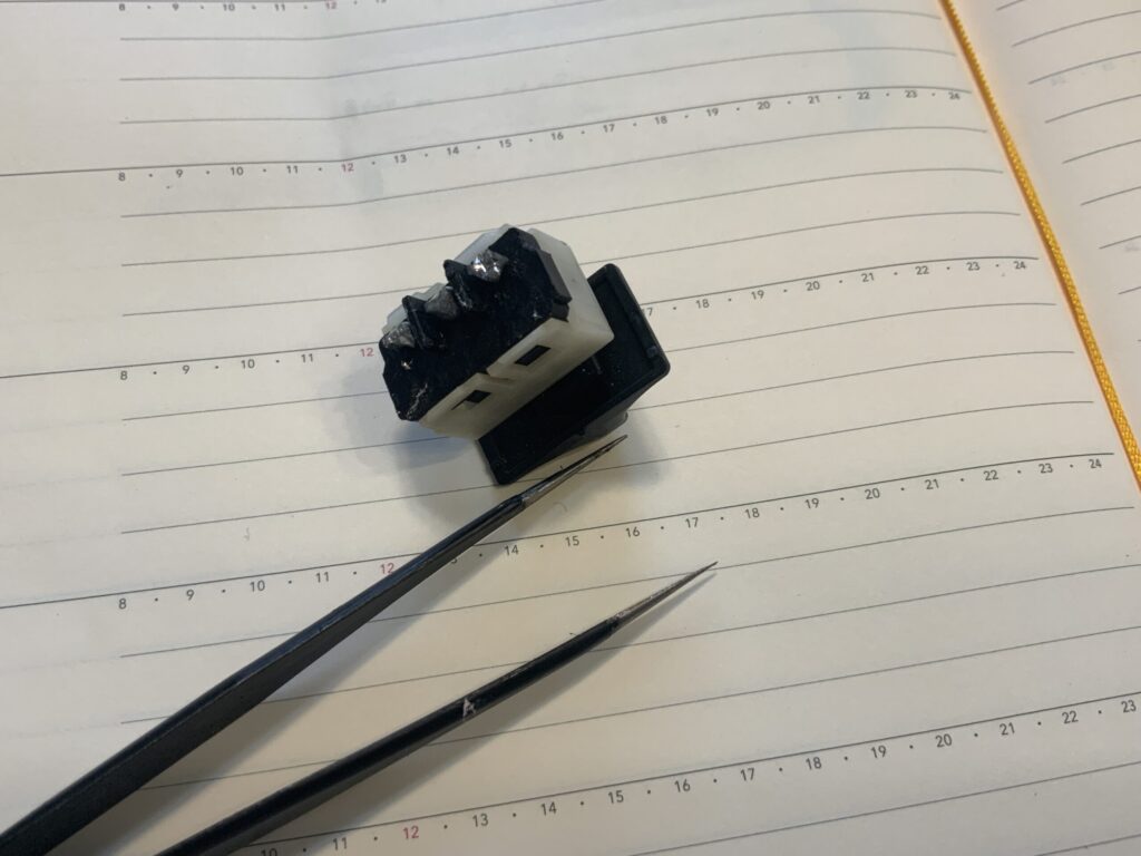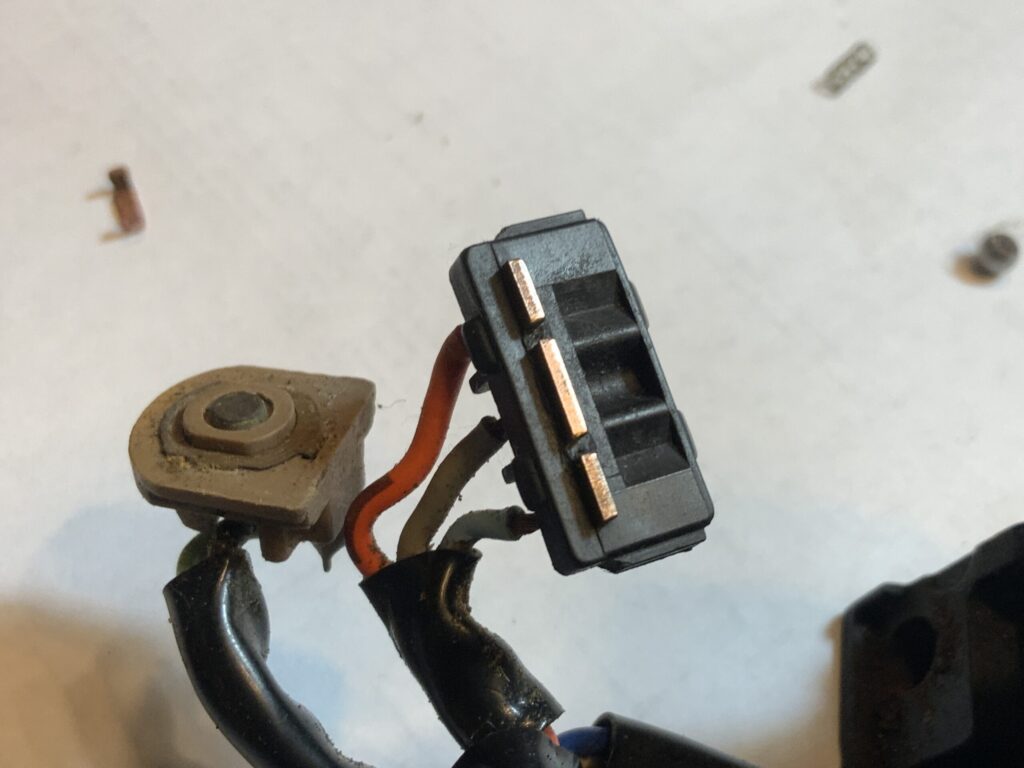 スイッチ内部は接点曲がり有り。ひび割れ部分はプラリペアで補強し、ON/OFF・左右(橙線・空色線)のショート無しを確認。接点用他バネ、接点、ベアリングを洗浄し、グリスアップ、クリック感のあるしっかりしたスイッチに復活しました。(ウインカースイッチは新品部品がもう何処にもないので大事にしたい部品です)