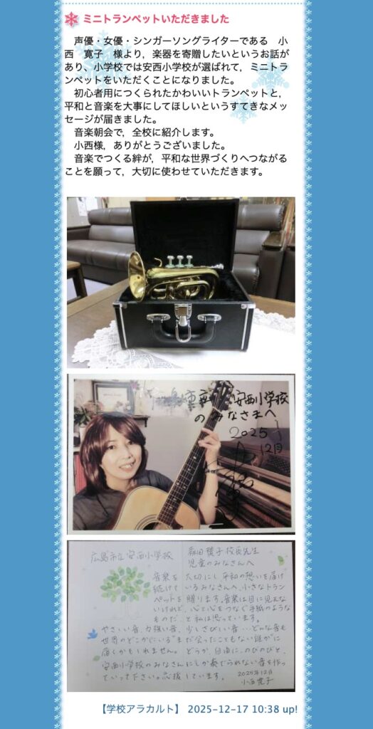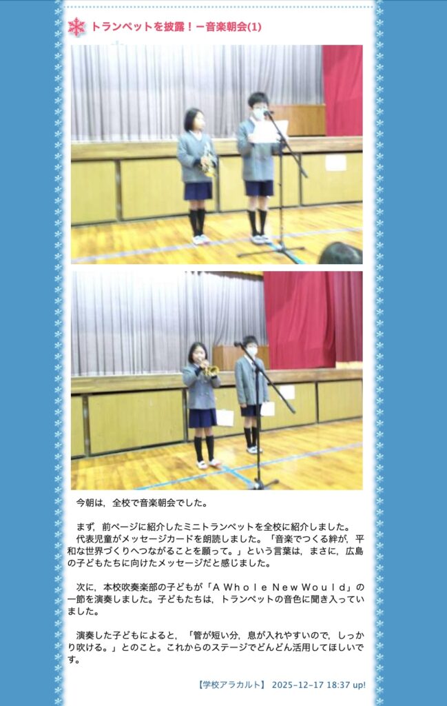 私のミニトランペットが同校に届き、そのことが学校のウェブサイト(学校報)にも掲載されました。